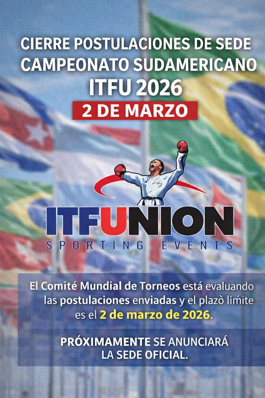 El Comité Mundial de Torneos de ITF Union informa a toda la comunidad internacional que el plazo oficial para la postulación de sede del Campeonato Sudamericano ITFU 2026 finaliza el próximo 2 de marzo de 2026.